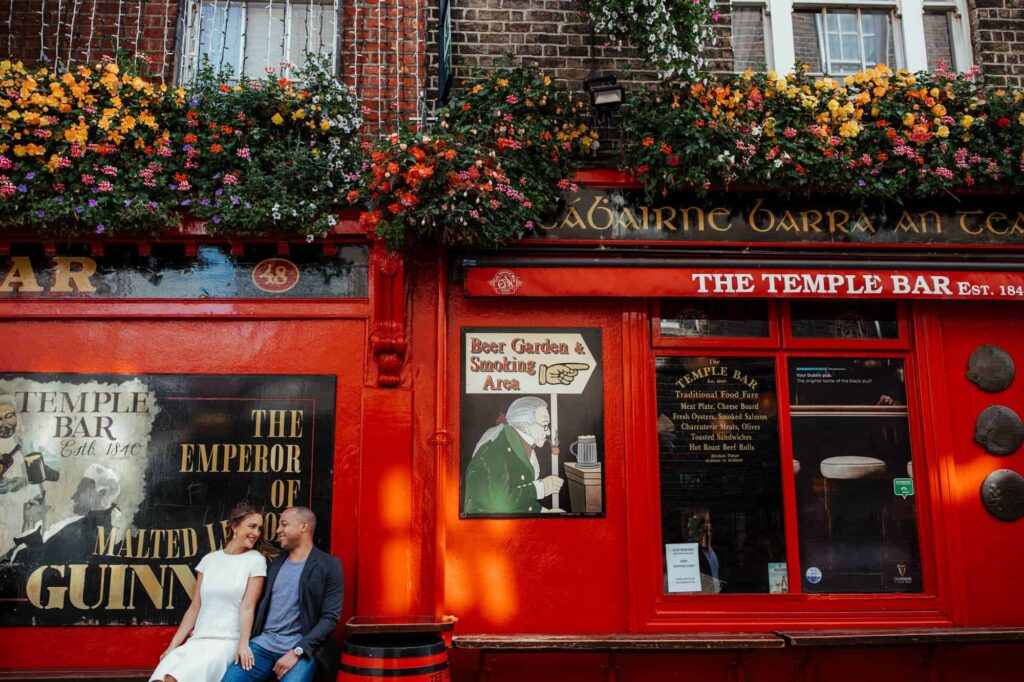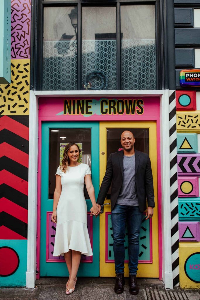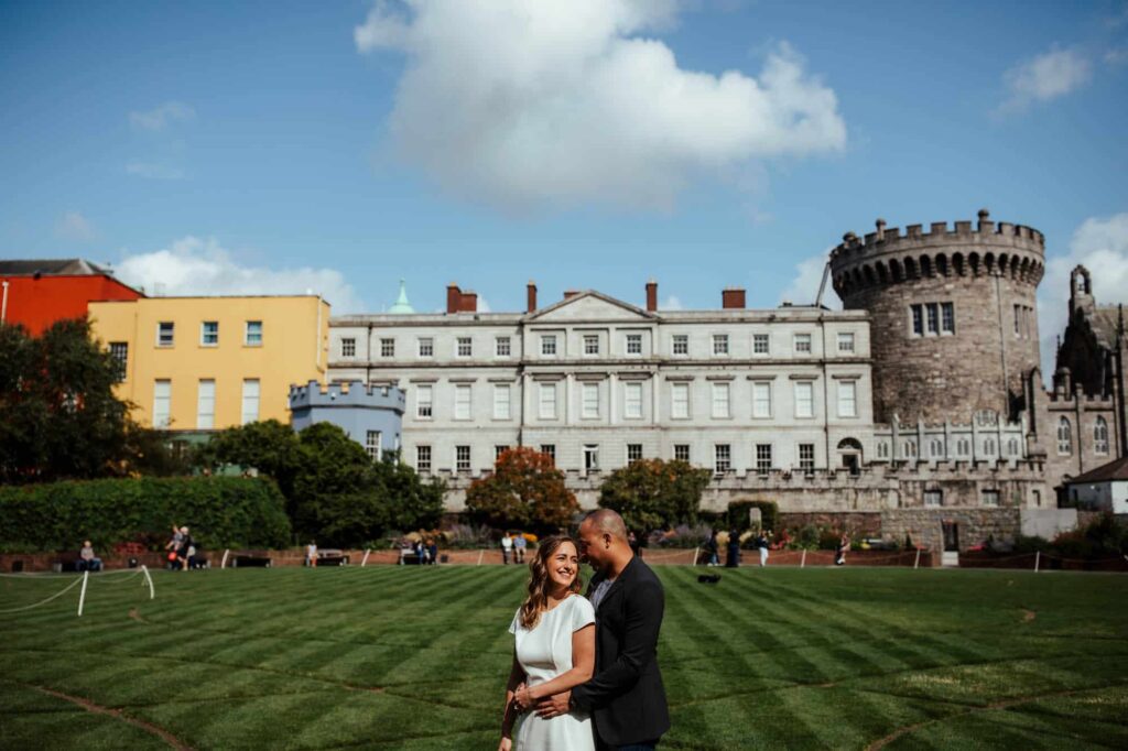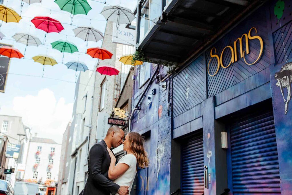 Camden decided to propose late at night on Dublin’s most romantic bridge – the Ha’Penny Bridge. So that’s exactly where we started our shoot. Dublin has many iconic spots, and the white Ha’Penny Bridge against the blue water of the Liffey provides a gorgeous backdrop. We went on to explore the colourful buildings of the Temple Bar, the sunny Dublin Castle, the festival-looking Dame Lane and the hanging umbrellas of Grafton Street. We finished off on the quiet campus of Trinity College, just in time for celebratory breakfast!