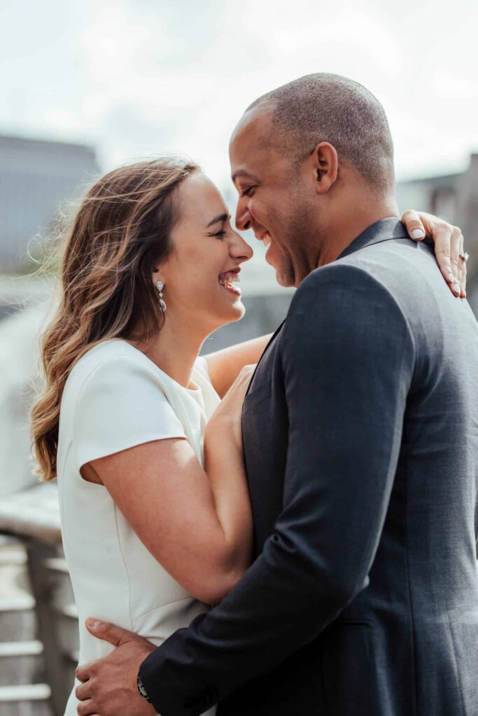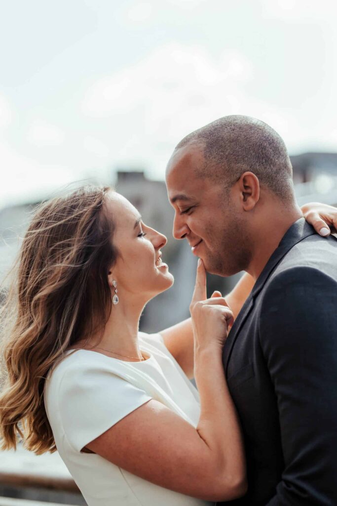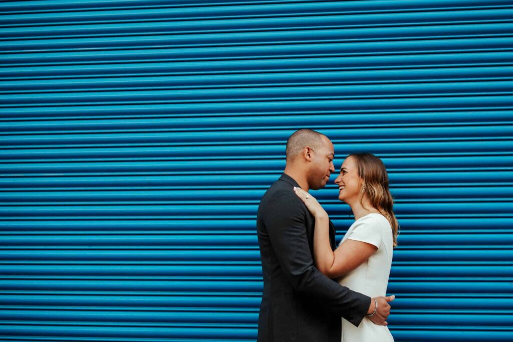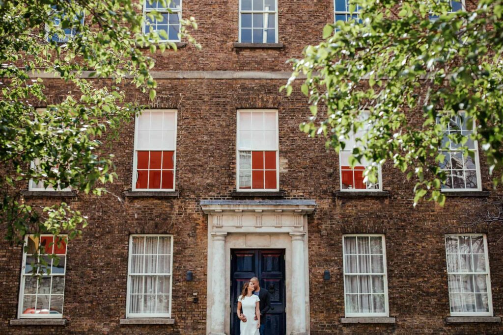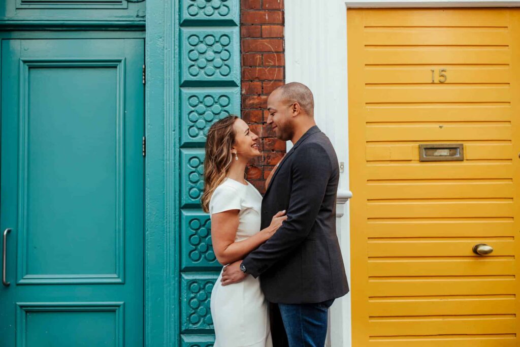 Camden decided to propose late at night on Dublin’s most romantic bridge – the Ha’Penny Bridge. So that’s exactly where we started our shoot. Dublin has many iconic spots, and the white Ha’Penny Bridge against the blue water of the Liffey provides a gorgeous backdrop. We went on to explore the colourful buildings of the Temple Bar, the sunny Dublin Castle, the festival-looking Dame Lane and the hanging umbrellas of Grafton Street. We finished off on the quiet campus of Trinity College, just in time for celebratory breakfast!