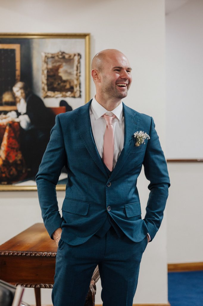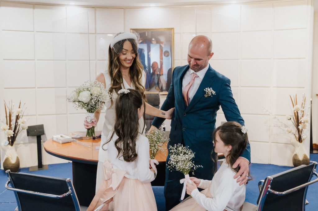 Once there, you’ll go through a little courtyard into the registry office itself. There’s a waiting room and the ceremony room behind double doors, accommodating up to 60 of your guests. At the top of the room there is a wooden desk with 4 chairs in front of it, for the couple and the witnesses. The registrar sits in the chair behind the desk. You can use flowers for decoration but no confetti or rice is allowed.