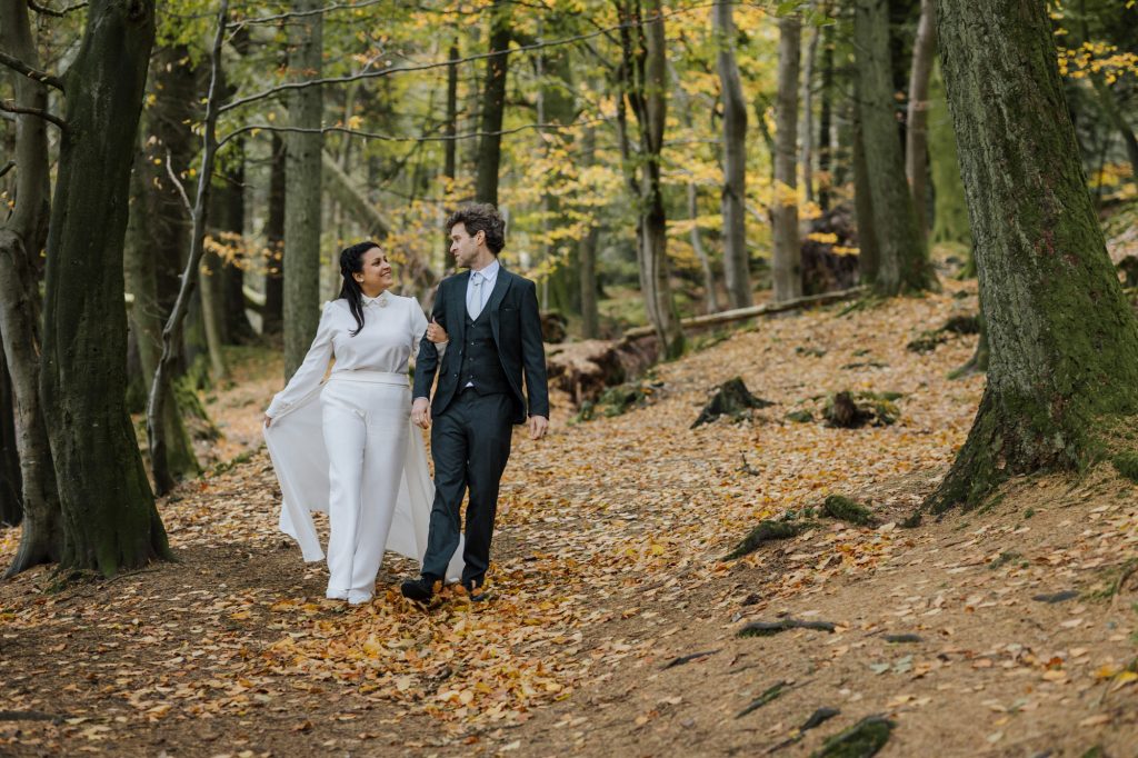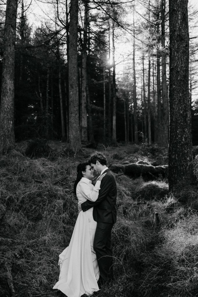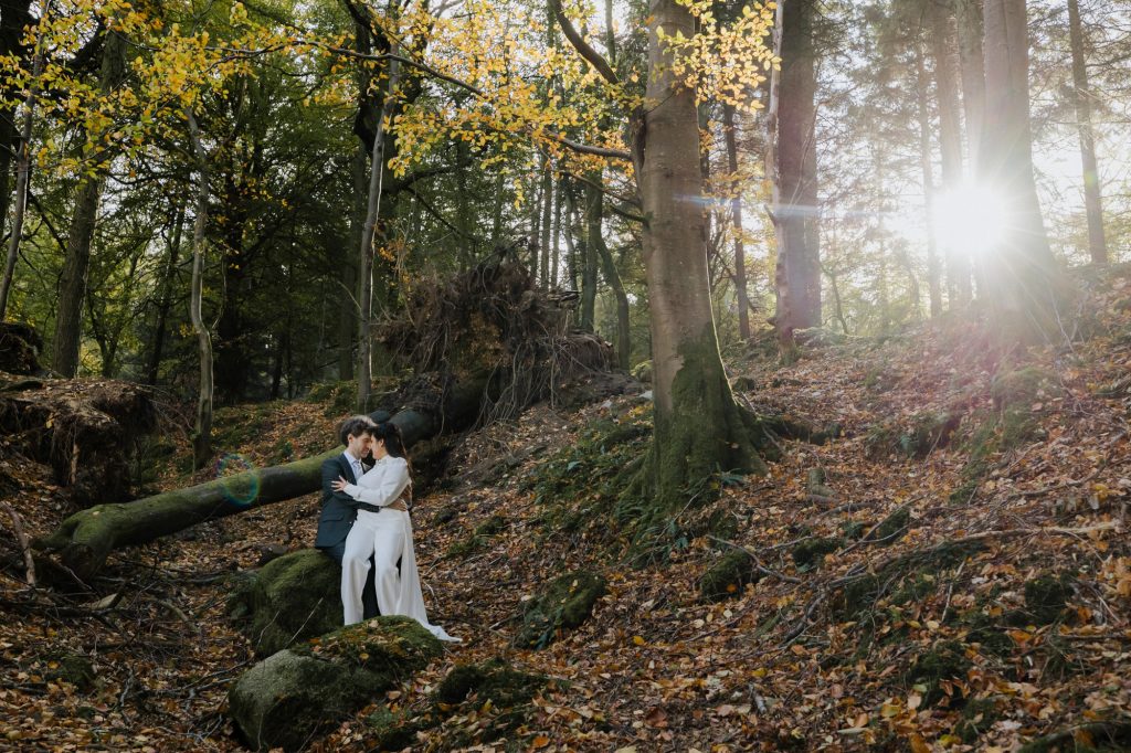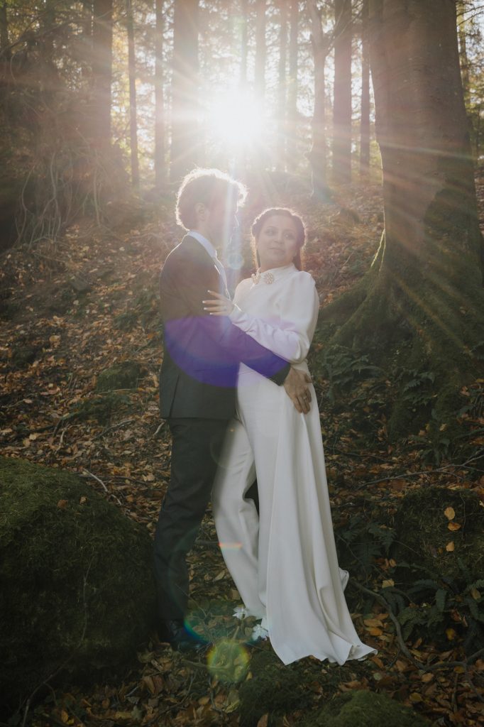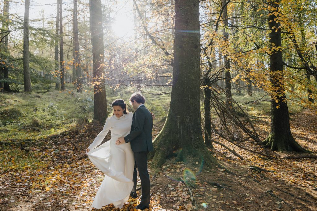 After the ceremony, we headed to the Dublin Mountains for some breathtaking autumnal photos in the forest. As avid hikers who spend their weekends exploring Ireland’s stunning nature, Valentine and Dominic wanted their photos to reflect what they love most about their adopted home. It was the perfect way to celebrate their shared journey and their love for the wild beauty of Ireland.