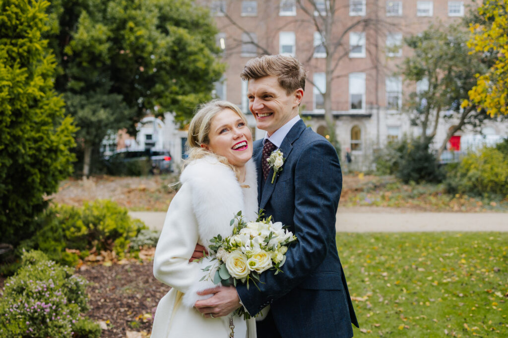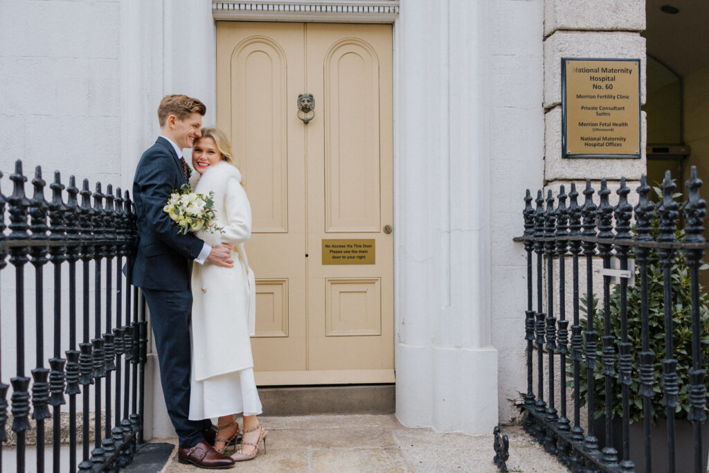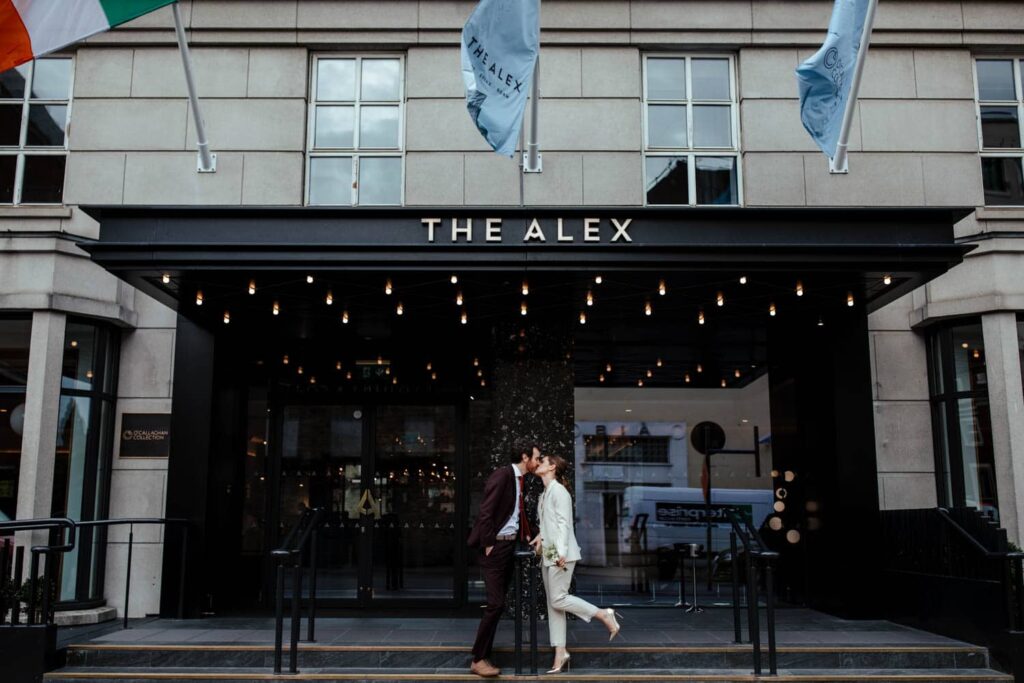 Siobhan and Gavin are both from Ireland but they were having a big destination wedding in France. They decided to have a Dublin Registry Office wedding with just the closest family and friends followed by lunch at the Alex hotel. It’s an easy 7-minute walk from the Registry Office. We popped into Merrion Square across the street for a few wedding photos. As a bonus, Siobhan got to have two outfits for her wedding – how cool is that?